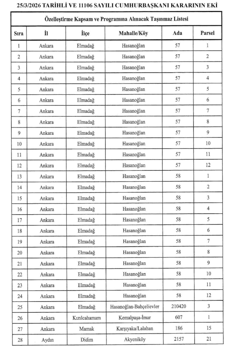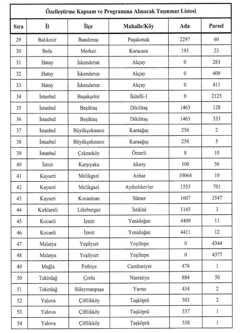 Buna göre üzerindeki yapılarla birlikte Ankara’da 27, Aydın’da 1, Balıkesir’de 1, Bolu’da 1, Hatay’da 3, İstanbul’da 6, İzmir’de 1, Kayseri’de 3, Kırklareli’de 1, Kocaeli’de 2, Malatya’da 2, Muğla’da 1, Tekirdağ’da 2, Yalova’da 3 taşınmaz özelleştirilecek.