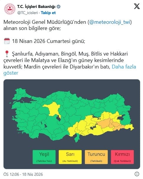 İçişleri Bakanlığı, Meteoroloji Genel Müdürlüğü’nden alınan son bilgiler doğrultusunda 18 Nisan 2026 Cumartesi günü için 20 ilde kuvvetli yağış beklendiğini duyurdu. Açıklamada, bazı bölgelerde sağanak ve gök gürültülü sağanağın çok kuvvetli, yer yer de şiddetli olması bekleniyor. Bakanlık bazı şehirlerde anı su baskınları ve sel felaketinin yaşanabileceğini belirtti.