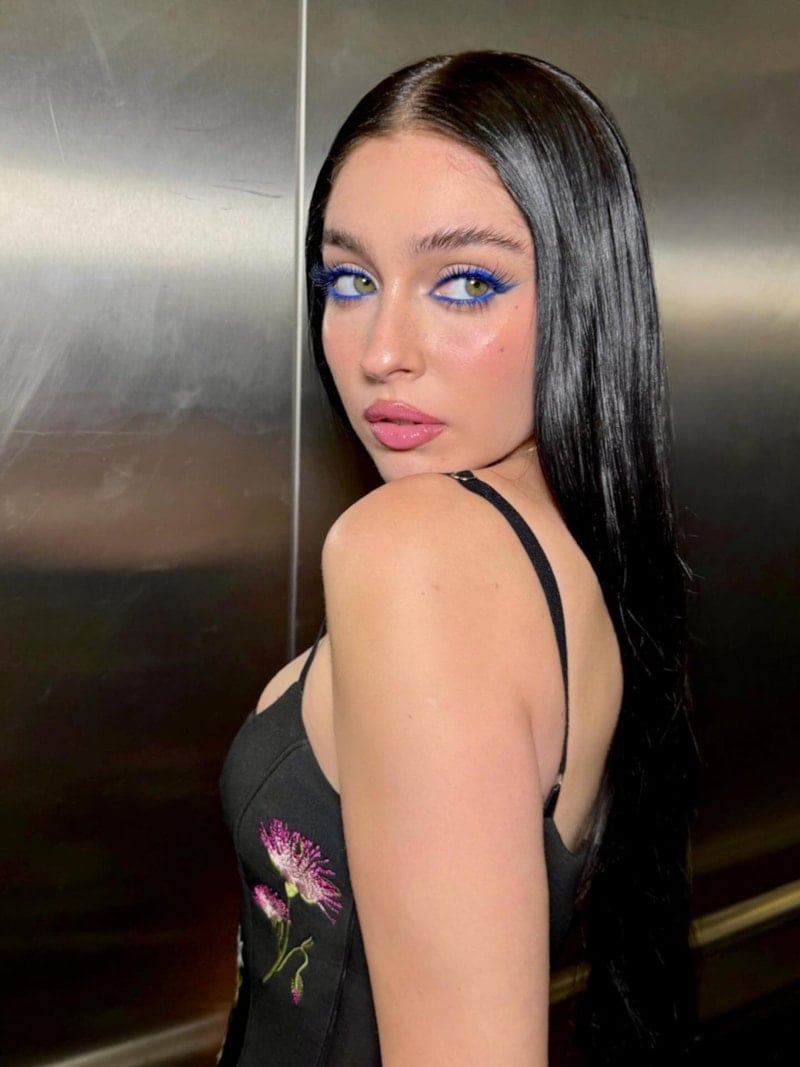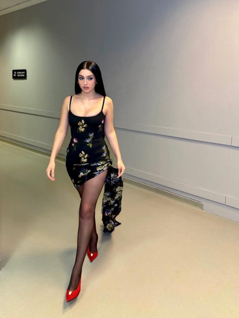 Siyah üzeri çiçek desenli mini elbise, zarif askıları ve vücuda oturan kesimiyle feminen bir siluet ortaya koyuyor. Derin yırtmaç detayı ve transparan çorapla tamamlanan görünüm, şıklığı cesur bir dokunuşla buluşturuyor.