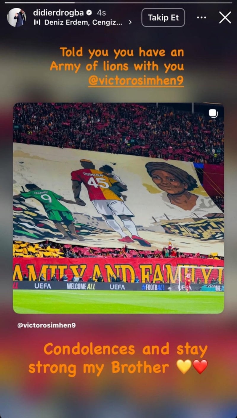 2013-2014 yıllarından Galatasaray formasını giyen Drogba, Osimhen’e “Sana yanında bir aslan ordusu olduğunu söylemiştim. Başın sağ olsun ve güçlü kal kardeşim” mesajıyla destek çıktı.