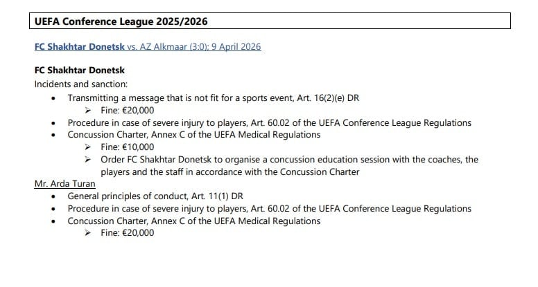 Shakhtar Donetsk, UEFA’nın beyin sarsıntısı protokolünü ihlal ettiği için 10 bin Euro ceza aldı. Teknik direktör Arda Turan da, Isaque Silva’yı beyin sarsıntısı sonrası hemen oyundan çıkarmadığı gerekçesiyle 20 bin Euro para cezasına çarptırıldı.