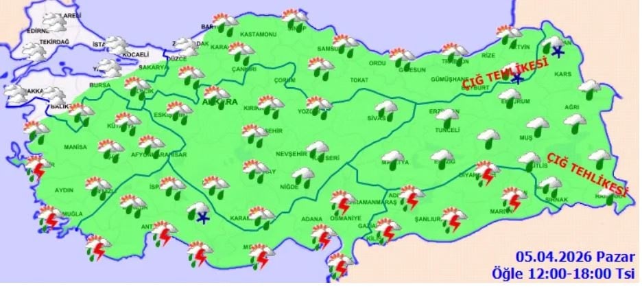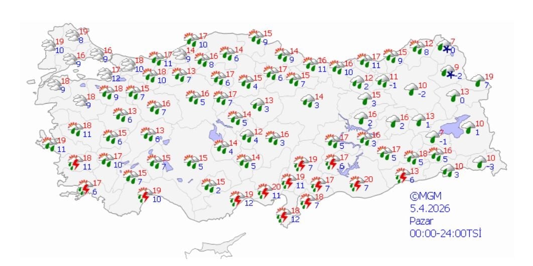 Meteoroloji tarafından 5 Nisan 2026’ya ilişkin yayınlanan hava durumu raporunda, yurt genelinde parçalı ve çok bulutlu bir havanın etkili olacağı, birçok bölgede yağış görüleceği belirtildi.